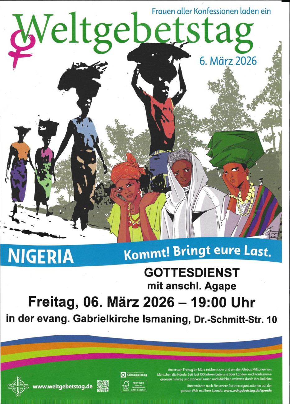 Wir laden Sie herzlich ein zum Weltgebetstags-Gottesdienst am 6. März 2026 in die Gabrielkirche Ismaning um 19 Uhr mit anschließendem gemütlichem Beisammensein und Gelegenheit zum Austausch.